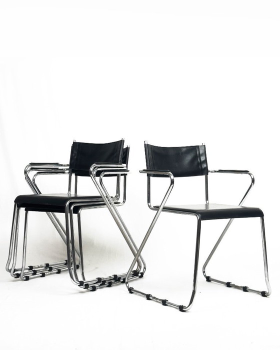 Een set van 4 vintage cantileverstoelen met een strakke, architectonische vormgeving, waarbij een gepolijst chromen buisframe gecombineerd wordt met zwarte lederen bekleding. Met hun uitgebalanceerde proporties en ingetogen lijnen weerspiegelen de stoelen de tijdloze aantrekkingskracht van Bauhaus-geïnspireerd en modernistisch design.
