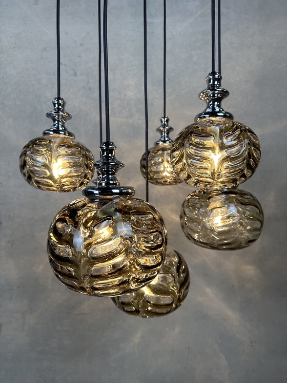 Grote vintage cascade hanglamp met 7 lichtpunten. Mondgeblazen gefumeerde glazen globes met bladreliëf. Gemerkt met het Oberglas Austria label. In mooie staat. 1 chroom houder staat beetje open zonder veel erg (zie laatste foto). 7x e14 fitting. Details in chroom. Totale lengte (inkorten naar wens): 125cm. Diameter: 55cm. Diameter globes: 3 keer 16cm en 4 keer 20cm. Gewicht: 9kg.