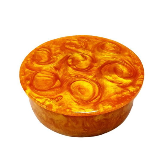 Stap de gouden eeuw van design binnen met deze prachtige vintage Catalin bakelieten sieradendoos, een waar verzamelobject uit de jaren 30 en 40. Gemaakt van rijk gemarmerd amber-oranje Catalin, roept het wervelende patroon gesmolten lava en stralende zonsondergangen op - een opvallende blikvanger voor elke kaptafel of plank.