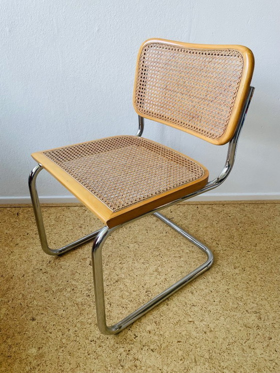 Vintage cantileverstoel in de stijl van Cesca (Knoll/Marcel Breuer). Chroom buisframe met zitting en rugleuning van hout/riet/rotan, in goede, solide staat en structureel gezond, met enkele gebruikssporen passend bij de leeftijd. Zitvlak: 47 cm (B) x 43 cm (D).