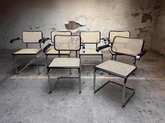 Mooie set van 6 vintage designstoelen in de stijl van Marcel Breuer met verchroomd buisframe en naturel rieten webbing zitting en rugleuning. Voorzien van armleuningen en vervaardigd in Italië.