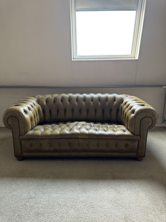 Stap binnen in een wereld van tijdloze elegantie met deze vintage Chesterfield-bank. Het klassieke ontwerp en de rijke lederen bekleding maken het een blikvanger in elke woonkamer. Stel je voor hoe je na een lange dag wegzakt in de zachte kussens, omringd door de warme, uitnodigende tinten van de prachtige lederen afwerking. Deze bank is niet alleen mooi om te zien; comfort en stijl komen hier perfect samen.