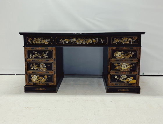 Een prachtig en zwaar massief houten bureau in karakteristieke Chinese stijl. Het heeft maar liefst negen lades, elk afgewerkt met elegante koperen handgrepen. De lades en de omringende oppervlakken zijn met de hand beschilderd met gedetailleerde taferelen van mensen, bloemen en planten, wat het meubel een authentieke en decoratieve uitstraling geeft.