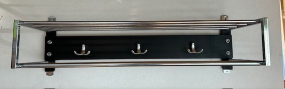Vintage chrome wandkapstok met 3 dubbele haken op zwart houten achterwand, stang aan de voorzijde is geschikt voor kledinghangers.