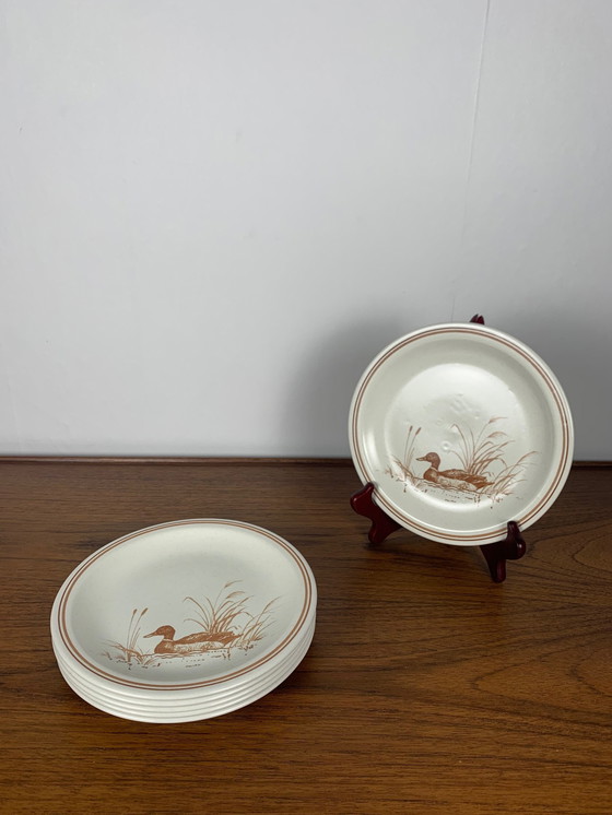 Churchill England servies, met een charmante eendendecoratie omringd door een dubbele rood/bruine rand, 1980/90