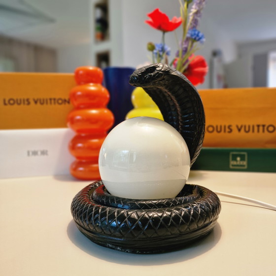 Sfeerlamp "Cobra", gemaakt door het Italiaanse bedrijf Avobin eind jaren 70. De bol is origineel. Verkeert in uitstekende staat voor zijn leeftijd.