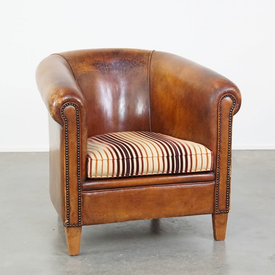 Aangeboden deze karaktervolle, vintage cognac-kleurige clubfauteuil gemaakt van schapenleer met een kleurrijk stoffen zitkussen.