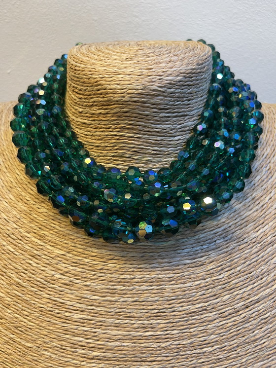 Deze vintage collier uit de jaren 1970 is een prachtig sieraad met prachtig gefacetteerde groene glaskralen. Het decoratieve ontwerp en de levendige kleur maken het een opvallende accessoire voor elke outfit. De ketting is in goede staat, met wat lichte verkleuring op een paar kralen, wat bijdraagt aan de vintage charme. Perfect voor verzamelaars of iedereen die op zoek is naar een unieke toevoeging aan zijn sieradencollectie.