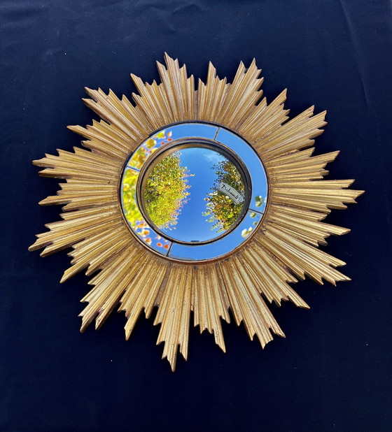 - Vintage convex/bolle goudkleurige zonnespiegel van Belgisch kwaliteitsmerk Deknudt - De spiegel dateert van de jaren 60/70, met centraal een convexe spiegel/heksenspiegel/bolle spiegel - Totale diameter is 46cm. De centrale ronde spiegel heeft diameter van 14cm, met spiegelrand is de diameter 19cm - De lijst is van hars of kunststof, goudkleurig - Het originele etiket is nog zichtbaar op het glas - In goede vintage staat. Hier en daar wat zilververlies in de spiegelrand rond de convexe spiegel (zie foto's). Conditie is conform leeftijd en gebruik - Item wordt zorgvuldig verpakt en verzonden vanuit België