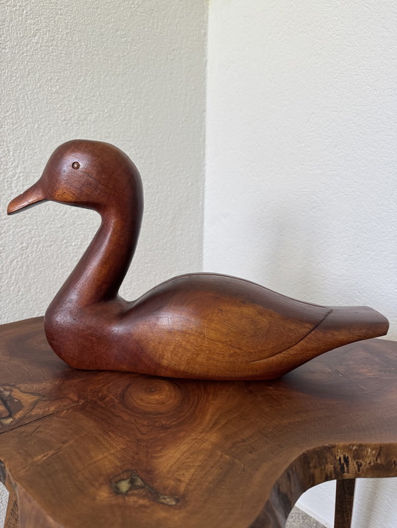 Prachtige grote decoratieve eend in vintage exotisch hout (jaren 70), zeer goede staat. Lengte: 42cm Breedte: 12.5cm Hoogte: 25cm Snelle en zorgvuldige levering