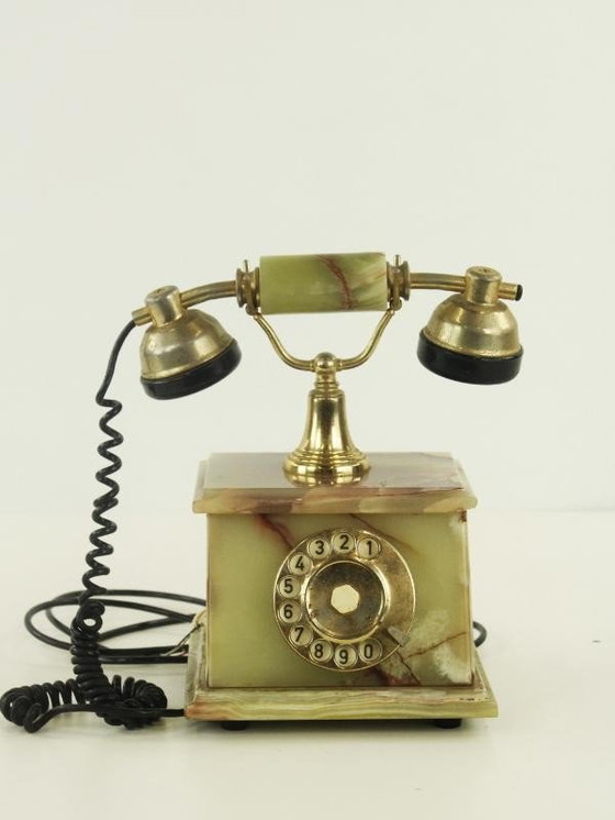 Decoratieve vintage telefoon vervaardigd uit massief onyx en messing, uitgevoerd in een klassiek model met draaischijf. De hoorn bevat bakelieten onderdelen en aan de achterzijde is een messing bel aanwezig.