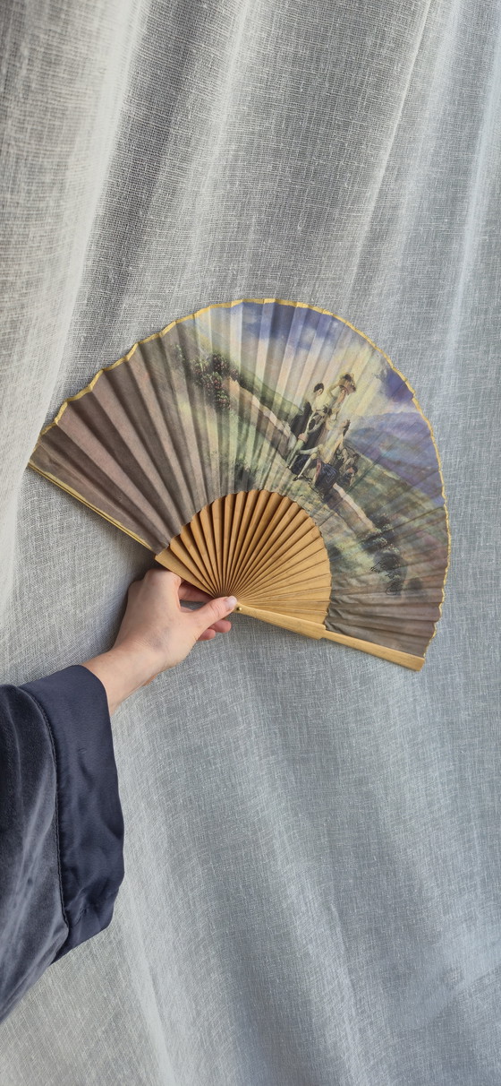 Deze vintage decoratieve waaier heeft een charmante Goya-scène en is 27 cm breed. De waaier is gemaakt van hout en textiel en heeft een prachtig veelkleurig ontwerp. Het is een perfect decoratief object voor liefhebbers van vintage esthetiek en klassieke kunstscènes.