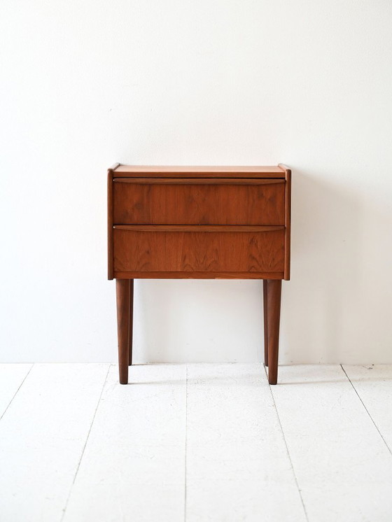 Vintage nachtkastje, gemaakt in Denemarken in de jaren 60, vervaardigd van teakhout. Met twee lades met geïntegreerde gebeeldhouwde handgrepen en taps toelopende poten. Strakke en elegante lijnen, typisch voor het Scandinavische design uit het midden van de vorige eeuw.