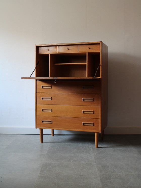 Vintage Deense barkast/secretaire gemaakt door de Westergaards Møbelfabrik, midden jaren 60 van de vorige eeuw. De vintage kast is ontworpen door Erik Jensen, wie vooral bekend is geworden om het ontwerpen van trolleys en andere barkasten met een combinatie van glas, metaal en teakhout. Jensen stond bekend om zijn eenvoudige, functionele stijl, waar zijn ontwerpen vaak zijn geïnspireerd door de natuur en organische vormen en weerspiegelden de principes van de Scandinavische designbeweging. Jensen won talrijke prijzen en onderscheidingen tijdens zijn carrière.