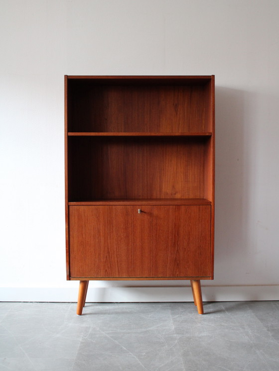 Vintage Deense boekenkast met klep, vermoedelijk ontworpen en vervaardigd door Ølholm Møbelfabrik, een Deense meubelmakerij bekend om degelijk vakmanschap en strakke, functionele ontwerpen. De kast is gemaakt van warm teakhout en combineert elegantie met praktische opbergruimte.