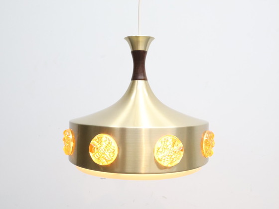 Vintage hanglamp herkomst Denemarken geborsteld aluminium in een nathouden kleur. Glazen kleurstene in amberkleur. Kunstof diffuser. Teakhouten detail. In nette vintage staat hoogte (kap) 27 cm diameter 30 cm