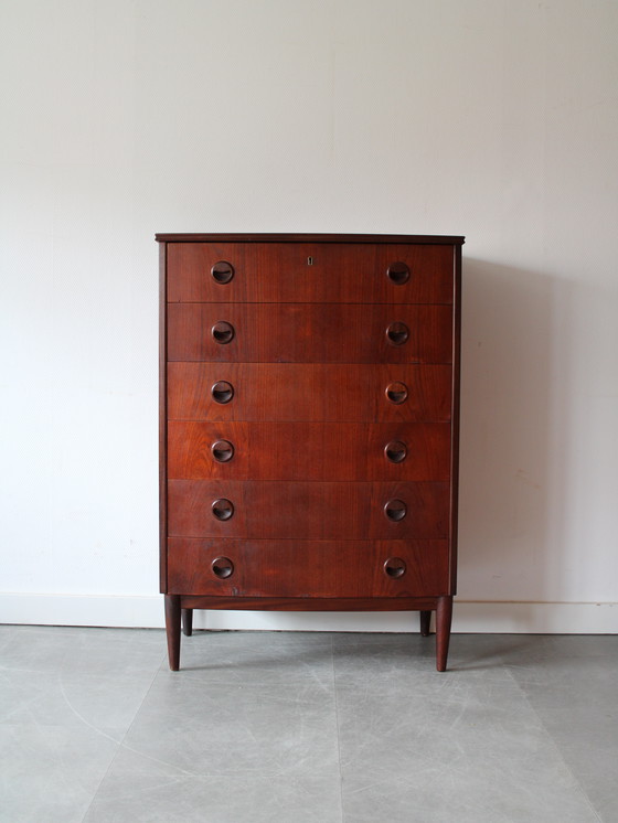 Prachtige vintage ladekast uitgevoerd in teakhout en geproduceerd in Denemarken door onbekende Deense Møbelfabrik. Dat het meubel kenmerken heeft en kwaliteit toont van deze Deense topdesigner, staat buiten kijf. Deense meubelen staan bekend om hun hoge kwaliteit meubelproductie met een strakke vormgeving en verfijnde details. Ontwerpen in deze aard zijn typerend voor het Deense midcentury design, waarbij functionaliteit en elegantie hand in hand gaan.