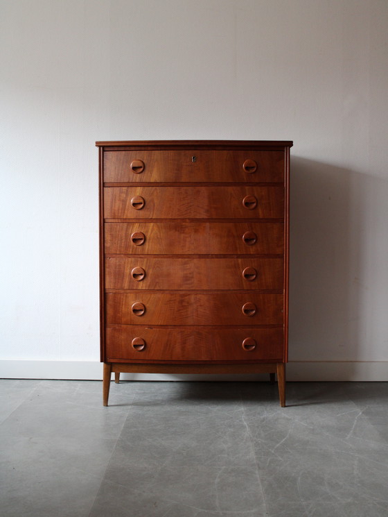 Prachtige vintage ladekast uitgevoerd in teakhout en geproduceerd in Denemarken. Alle kenmerken doen vermoeden dat Kai Kristiansen aan de basis stond van het ontwerp van deze ladekast. Echter, helaas kunnen we dit niet bevestigen. Dat het meubel kenmerken heeft en kwaliteit toont van deze Deense topdesigner, staat buiten kijf. Deense meubelen staan bekend om hun hoge kwaliteit meubelproductie met een strakke vormgeving en verfijnde details. Ontwerpen in deze aard zijn typerend voor het Deense midcentury design, waarbij functionaliteit en elegantie hand in hand gaan.
