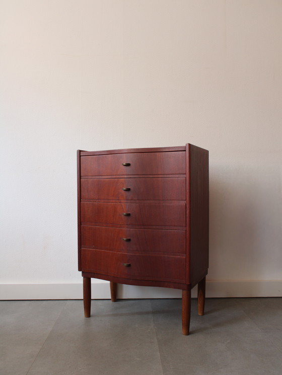 Vintage ladekast in teak geproduceerd in Denemarken. De ladekast is geproduceerd in de jaren 60 van de vorige eeuw en komt rechtstreeks uit het land van herkomst. De ladekast heeft 6 rondlopende lades met massieve houten grepen, sierlijk vormgegeven. Het geheel staat stevig op zijn taps toelopende poten.