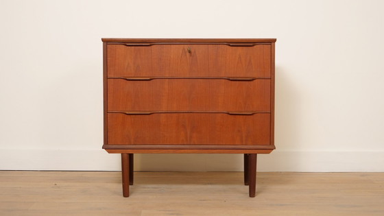Prachtige teak houten ladekast, afkomstig uit Denemarken. De vintage ladekast kast heeft 3 lades met prachtig ontworpen handgrepen. Vanwege het compacte formaat past de kast in diverse ruimtes.