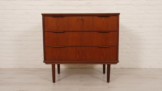 Prachtige teak houten ladekast, afkomstig uit Denemarken. De vintage ladekast heeft 3 lades met prachtig ontworpen handgrepen. Vanwege het compacte formaat past de kast in diverse ruimtes.