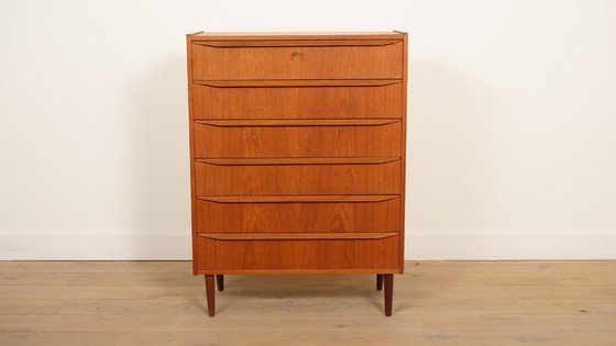 Deze stijlvolle vintage ladekast uit Denemarken is een ware eyecatcher voor ieder interieur. Het verfijnde ontwerp en de zorgvuldig afgewerkte details geven de kast een warme en authentieke uitstraling. Het diepe, rijke teak hout gecombineerd met de subtiele, strak vormgegeven grepen zorgen voor een elegant en minimalistisch karakter. Met zes ruime lades biedt deze kast volop praktische opbergruimte, zonder in te leveren op stijl.