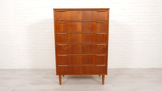Artikelnummer: 211511 Deze vintage ladekast is afkomstig uit Denemarken en biedt veel opbergruimte. De kast heeft 6 lades die zijn voorzien van prachtige houten grepen en een mooi patroon in het hout. Een fijne en praktische kast! Ontwerp periode: 1950 - 1960 Stijl: Mid century modern - Deens design - Scandinavisch design Materiaal: Teak Conditie: In goede vintage staat. Kleine gebruikerssporen die passen bij de leeftijd van het meubel. Ontwerper: Onbekend De afmetingen Hoogte: 121 cm Breedte: 82 cm Diepte: 44 cm