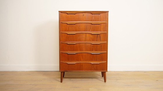 Deze prachtige Deense vintage ladekast is een echte blikvanger in elk interieur. Het tijdloze design en de prachtige afwerking van alle details geven de kast een warme, sfeervolle uitstraling. Het rijke teak hout, samen met de verfijnde handgrepen, zorgt voor een elegante en karaktervolle look. Met maar liefst zes ruime lades biedt deze kast volop ruimte om je spullen stijlvol op te bergen.
