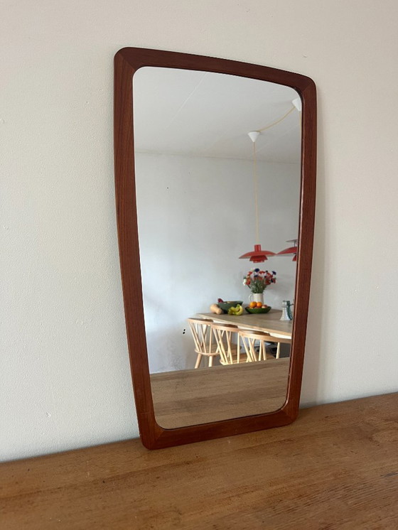 Prachtige vintage Deense teakhouten spiegel met mooie randen en een warme houtkleur.