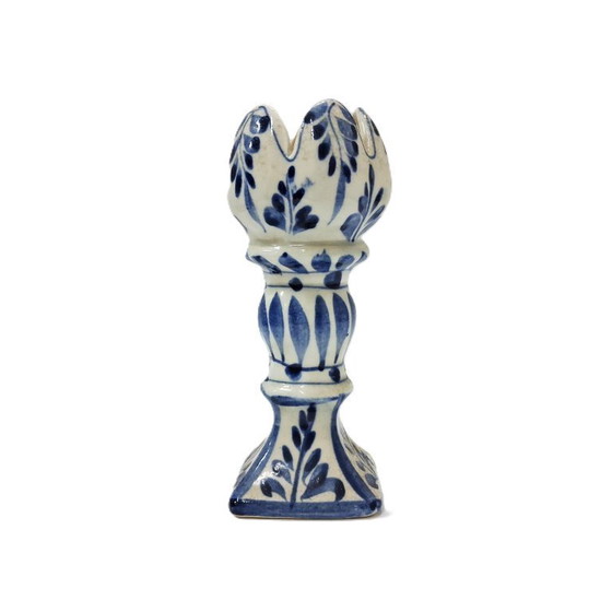 Stap binnen in een wereld van tijdloze elegantie met deze vintage Delftsblauwe tulpvormige kandelaar. Deze met de hand beschilderde keramische kandelaar, met oog voor detail vervaardigd, belichaamt de rijke traditie van Delfts ambacht. Het tulpvormige ontwerp en het klassieke blauw-witte kleurenpalet maken het een opvallende aanwinst voor elk interieur.