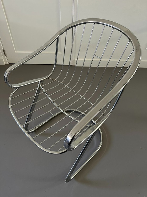 Een paar Italiaanse designstoelen van Gastone Rinaldi uit de jaren 70. De stoelen zijn verchroomd. De originele kussen zijn een keer vernieuwd. De stoelen hebben wat TLC nodig maar zijn verder in prima staat.