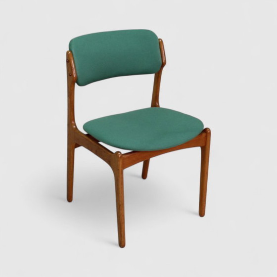 Deens Design vintage eetkamerstoelen, ontworpen door Erik Buchr. Een echte mid century klassieker, gemaakt in Denemarken in de jaren '60. Het elegante massief teak houten frame en in hele goede staat en bevat hier en daar wat lichte gebruikerssporen. De groene bekleding is niet origineel maar passen perfect bij een kleurrijk, modern interieur.