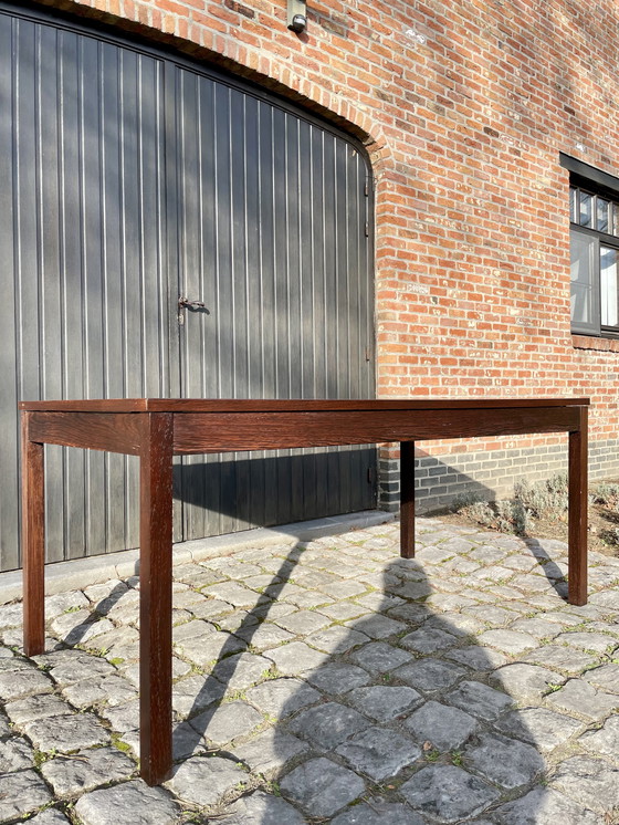 Een kwalitatief zwaar vol houten design meubel in een donkere tint, gemaakt in de jaren ‘70.