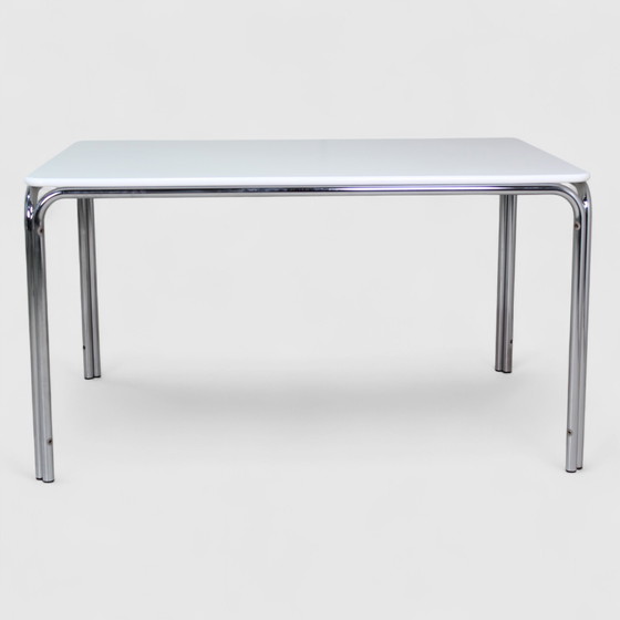 Witte vintage design eettafel van het designermerk TECTA. Deze ruime rechthoekige eettafel is gemaakt in de jaren '70 en is van chroom met een dik, kunststof blad. De tafel is onderhoudsarm en bevat wat lichte gebruikerssporen.
