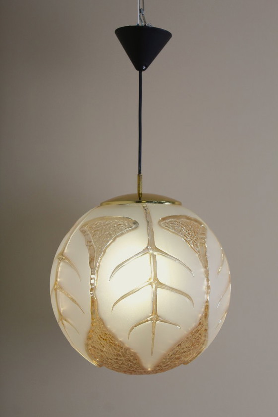 Deze geweldige grote, zware design hanglamp of bollamp is van Peill & Putzler. Deze zeldzame bollamp of globe, heeft kenmerkende matte bladeren van glas en amberkleuren. Hij komt uit de jaren '70 en is van topkwaliteit.