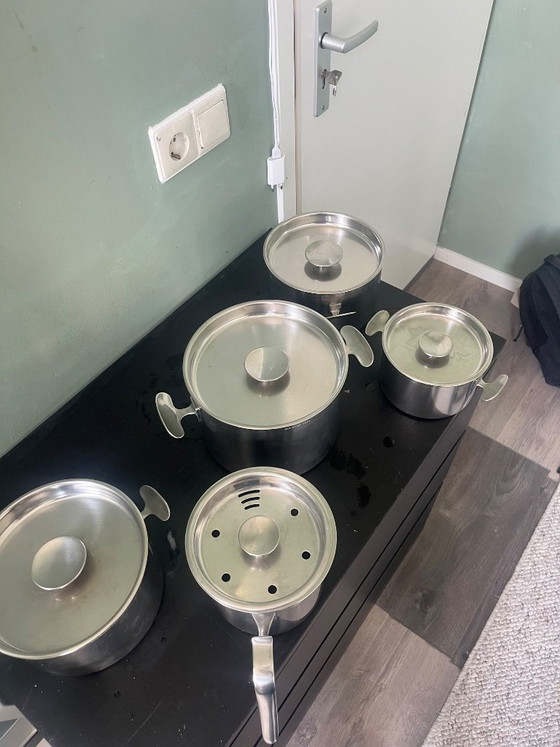 Te koop: De wereldberoemde pannenset ontworpen door Dick Simonis in 1958 voor Gero Zilmeta. Deze set is een schoolvoorbeeld van minimalistisch Dutch Design en werd bekroond met de hoogste designprijs, de 'Signe d'Or'. Het ontwerp is zo iconisch dat het is opgenomen in de vaste collectie van diverse grote musea.