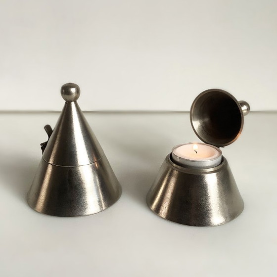 Deze vintage kandelaars in memphis stijl zijn een prachtige aanwinst voor elk interieur. Gemaakt van vernikkeld messing. Geschikt voor waxinelichtje kaarsen. Met hun postmodern ontwerp en zilveren afwerking stralen ze een unieke charme uit die zowel stijlvol als tijdloos is. Aldo Rossi stijl. De taps toelopende vorm en het gebruik van metaal benadrukken de innovatieve esthetiek van de Memphis beweging. In nette staat. Formaat 10 cm hoog en diameter 8 cm.