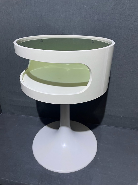 Deze vintage bijzettafel van Opal Möbel is een prachtig voorbeeld van Space Age-design. Zijn ronde vorm en strakke witte afwerking geven het een moderne en futuristische uitstraling. De tafel heeft een uniek ontwerp met open vakken, perfect voor het uitstallen van decoratieve items of het opbergen van kleine benodigdheden. Het stevige voetstuk zorgt voor stabiliteit, waardoor het zowel een functionele als stijlvolle toevoeging aan elke kamer is.