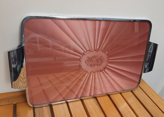 Super schattig dienblaadje met verchroomde rand en een bijzonder blad. Sunburst met rozen. Kleur roze. De inlay is van een soort kunststof (celluloid?) gemaakt. Daar bovenop een glasplaat. Achterkant van dik karton en iets verkleurd.