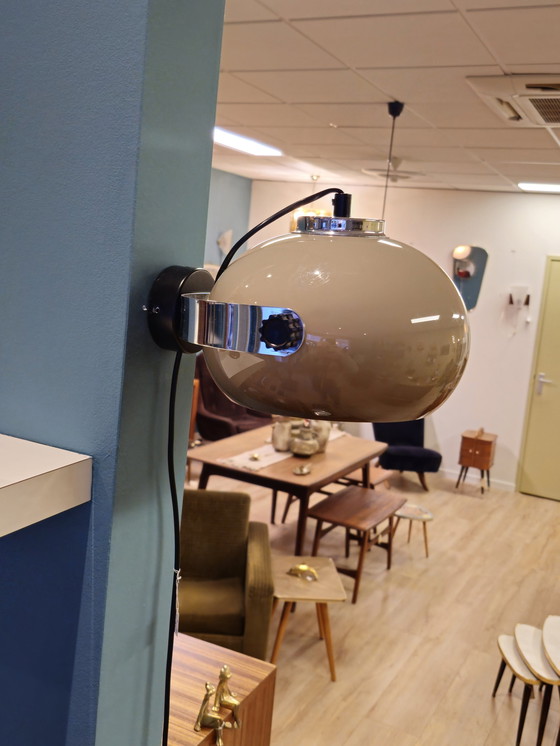 Vintage wandlamp, waarschijnlijk van Dijkstra. De lampenkap is van kunstof wj de meubels van chromen. De lamp heeft nieuwe bedrading. E27 fitting, exclusief lichtbron. Nette vintage conditie, lichte gebruiksporen. Afmetingen: H 19 x B 25 x D 26 cm.