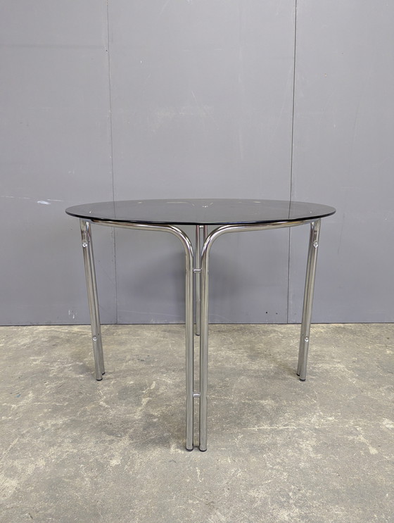 Gave vintage chrome buisframe eettafel met donkergekleurd rookglas/ smoked glass, wat de tafel een tijdloze elegantie geeft.