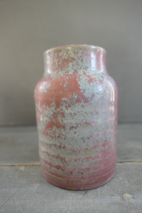 Vintage D.O.K. Vaas de Olde Kruyk Milsbeek Wijnrood Grijs. Hoogte 15 cm, Diameter 9,5 cm.