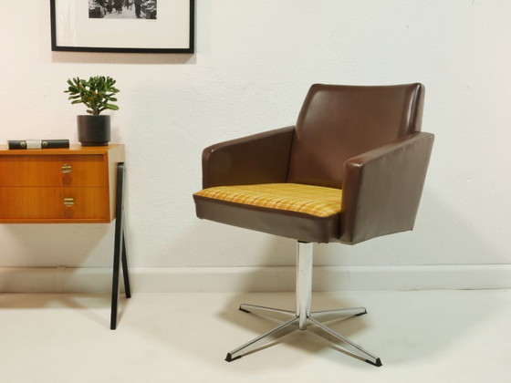 Vintage draaibare fauteuil uit de jaren 70, fauteuil in mid-century stijl, bruin kunstleer, chromen onderstel, retro loungestoel