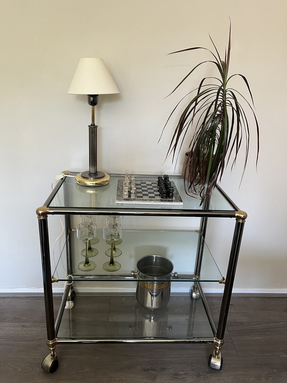 Prachtige vintage design drankenkar van het merk orsenigo in hollywood regancy stijl! De kat rolt nog soepel en het glas verkeerd in zeer goede vintage staat.