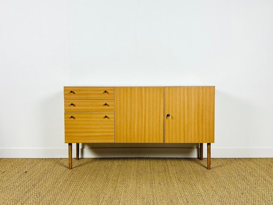 Vintage dressoir van formica met twee opbergdeuren, twee lades en een draaideur. Afmetingen: H76 B134 D35
