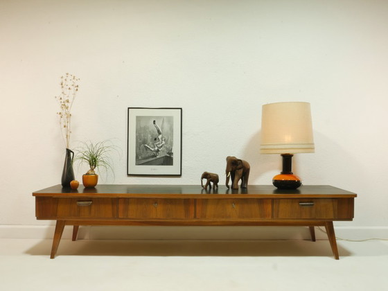 Het frame is gemaakt van sparren- en beukenhout en afgewerkt met elegant walnotenfineer. De warme houtnerf benadrukt de typische designtaal van de jaren 60 en geeft het meubel een elegante, natuurlijke uitstraling.