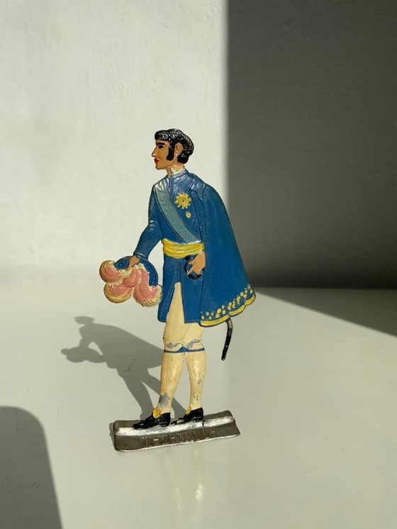 Een hoogwaardig, handbeschilderd vintage Duits plat tinnen beeldje (Flachfigur). Dit stuk behoort tot de serie "Neue Mode", die zich richt op de geschiedenis van Europese kleding en het hofleven.
