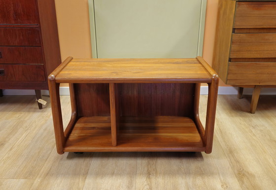 Prachtig vintage audiomeubel of platenspeler kastje op wielen van het Deense kwaliteitsmerk Dyrlund, vervaardigd uit teakhout in de jaren '70. Dit meubelstuk is ideaal voor het opbergen van je LP-collectie en biedt een perfecte plek voor je platenspeler bovenop. Er missen twee legplankjes, wat echter ruimte creëert voor hogere items of een ruimere indeling naar eigen wens. Een stijlvolle toevoeging aan elk interieur met een voorliefde voor Deens design en vintage audio.