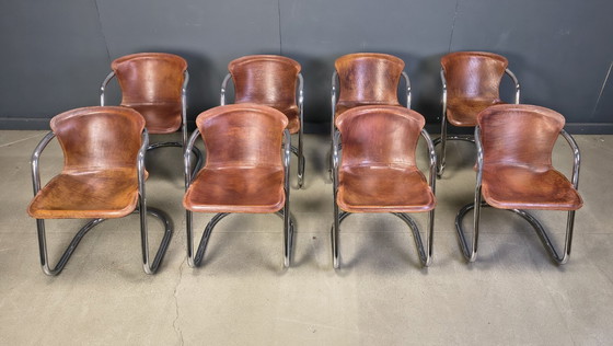Fantastische set van 8 eetkamerstoelen van Willy Rizzo, vervaardigd met een buisvormig chromen frame en prachtig gepatineerde lederen zittingen.