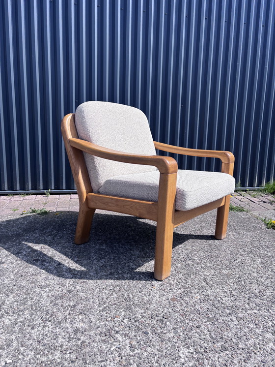 Deze vintage Dyrlund fauteuil heeft een stevig eikenhouten frame met een comfortabele beige stoffen bekleding. Het klassieke ontwerp en de robuuste constructie maken het een tijdloos stuk dat geschikt is voor elke woonruimte. De houten armen en poten van de stoel voegen een vleugje elegantie en duurzaamheid toe.